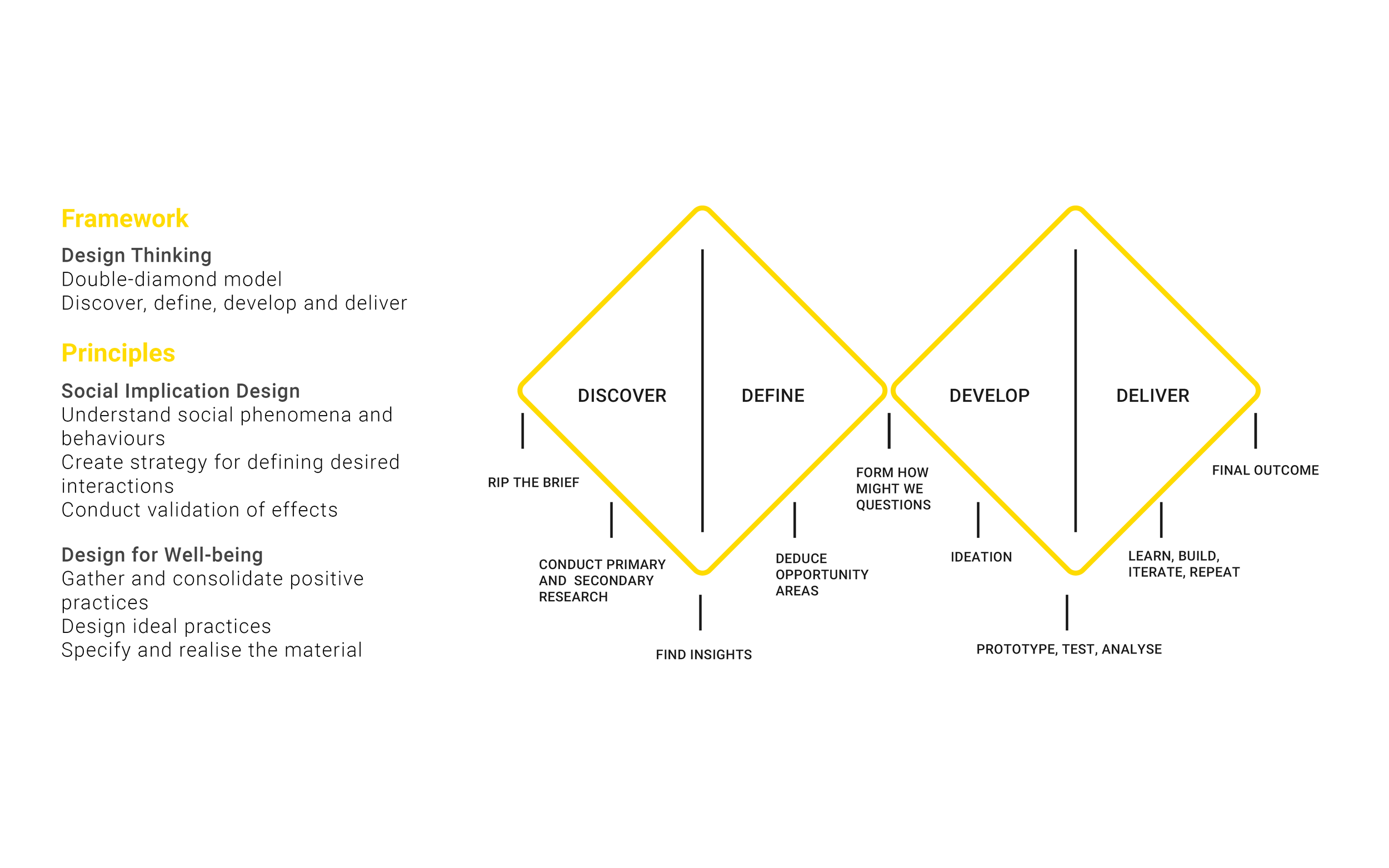 The model of research that best describes my method is design thinking, informed by principles of social implication design and design for well-being where I set out to explore the problem of mental ill-health in the military, the social phenomena and behaviours that contribute to that problem, and how I could design positive practices that change these behaviours.